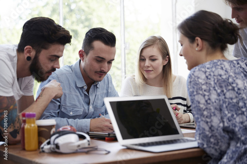 Group of creative professionals with laptop at table