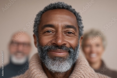 group of diverse friends with smiling faces gazing at camera against tastefully blurred backdrop