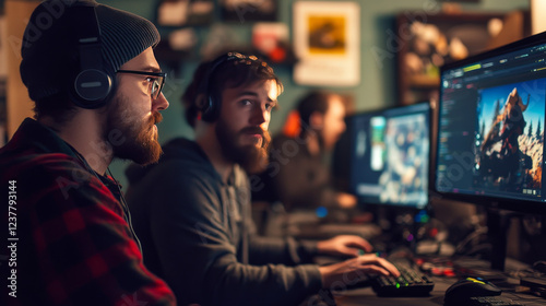 Group of diverse men using VR technology and developing modern visual effects for videogame and computing