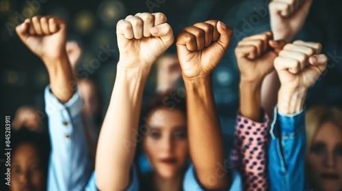 Group of diverse people raising clenched fists in a gesture of unity and solidarity, emphasizing empowerment and activism.