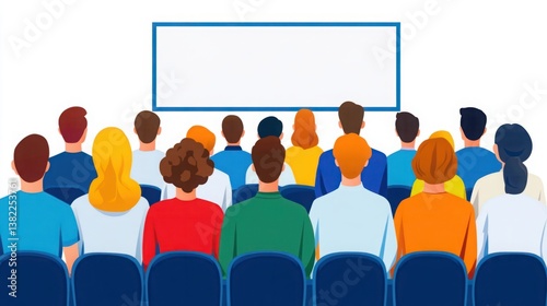 Group of Diverse People Sitting in a Hall Watching Presentation with Blank Screen in Front of Them, Educational Event, Business Meeting, Conference Setting