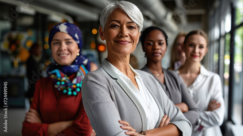 Group of diverse professional women confidently standing in a line, with the woman in the foreground crossing her arms, showcasing a strong and united front in a workplace setting.