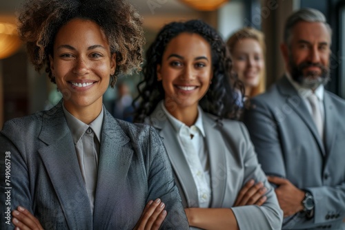 Group of diverse professionals standing confidently in an office environment, showcasing teamwork and leadership