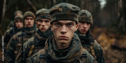 group of emotionless young soldiers in military uniform standing in a forest and looking at camera