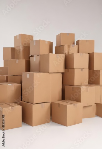 Group of empty brown cardboard boxes, white background , surface, disposal