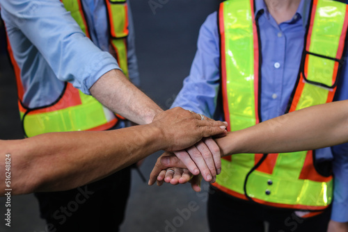 Group of engineer or worker in protective suit with hardhat standing and stacking hands celebrate successful together or completed deal commitment at heavy industry manufacturing factory or warehouse