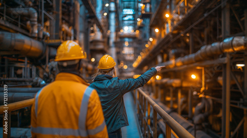 Group of engineer stands contemplatively with a hard hat, overseeing the busy operations of a bustling industrial facility.