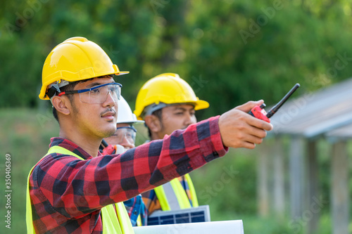 Group of engineer working on checking and maintenance with solar batteries near solar panels at sunny day in solar power plant station.