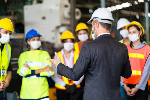 Group of engineers Workers wear protective face masks for safety in machine industrial factory. Worker man wearing face mask prevent covid-19 virus and protective hard hat.
