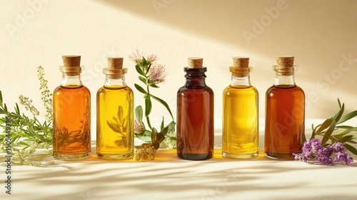 Group of essential oil bottles in different shades of amber, arranged with botanical props on a neutral backdrop