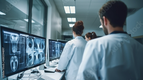 Group of expert woman Physician doctor diagnosis patient symptom using Medical X-Ray Examination Inside Hospital Medical Education. People health care technology innovation concept. Generative AI