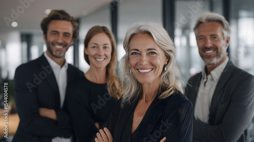 Group of four confident business professionals standing together in a modern office, with a smiling mature woman in the foreground and three colleagues blurred in the background