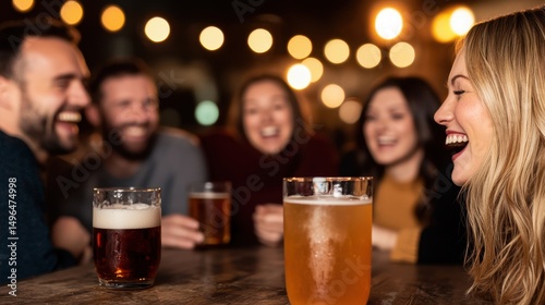 Group of Friends Enjoying Laughter and Drinks in a Cozy Dimly Lit Bar Atmosphere
