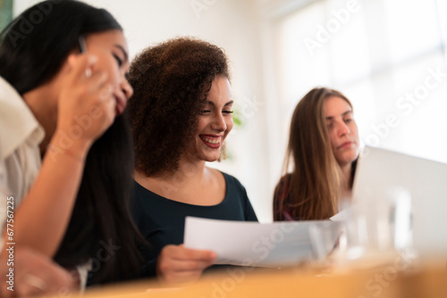 Group of happy young coworkers sitting at table with laptop while waving hands during video call meeting with colleague in modern workspace at daylight