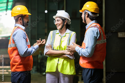 Group of Indian engineers wearing helmet and vest discussing and laughing, candid moment, Industrial factory concept, male and female worker smiling chatting in free time at project. work culture.