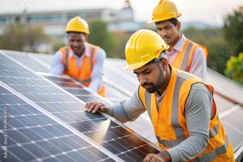 Group of Indian Workers Installing Solar Panels
