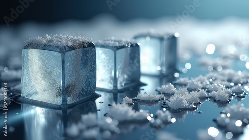 Group of melting ice cubes with water droplets on a reflective surface