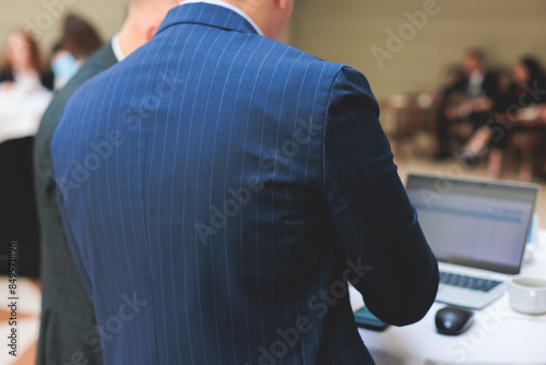 Group of men in business suits talking and discussing during coffee break at conference, politicians and entrepreneurs networking and negotiate, businessmen have a conversation dialog on a forum