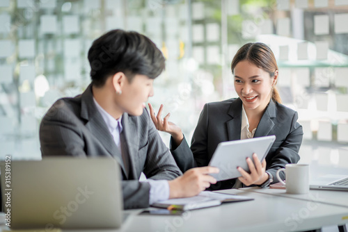 Group of modern business people are talking and smiling at the meeting. Asian business groups discussed investment and business planning at the meeting.