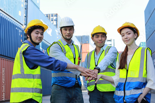 Group of multiethnic technician engineer and businessman in protective uniform standing and discussing, researching, brainstorming and planning work together with tablet at container cargo site