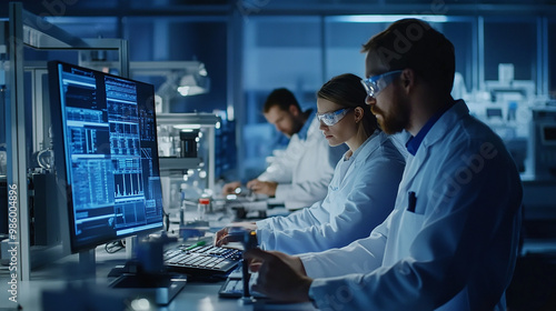 Group of operators control process on product line uses industry and digital technology on modern factory