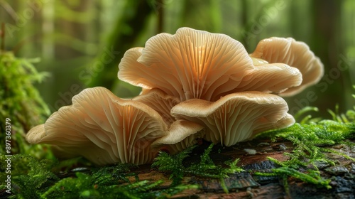 group of oyster mushrooms growing on mossy wood in forest, captured in macro photography with high resolution and super realistic details