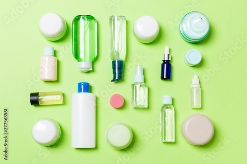 Group of plastic bodycare bottle Flat lay composition with cosmetic products on green background empty space for you design. Set of White Cosmetic containers, top view with copy space