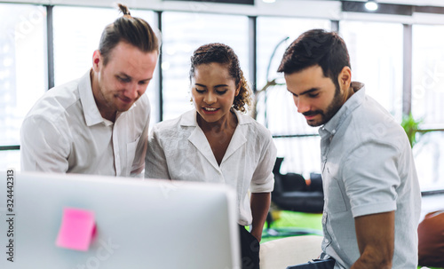 Group of professional business meeting and discussing strategy with new startup project.Creative business people planning and brainstorm with document report in modern workloft.Teamwork concept