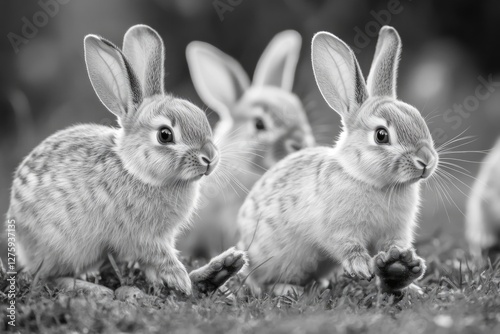 Group of rabbits sitting on a lush green field, perfect for nature or outdoor themed projects