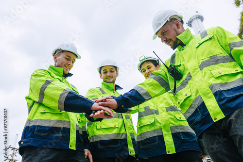 Group of Refinery Engineer team workers Join Hand for Collaboration Working. Industrial Worker Mix Together. Workers hands meeting job successfully.