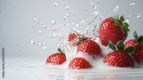 Group of ripe strawberries splashing into fresh milk, creating a ripple effect on white background.