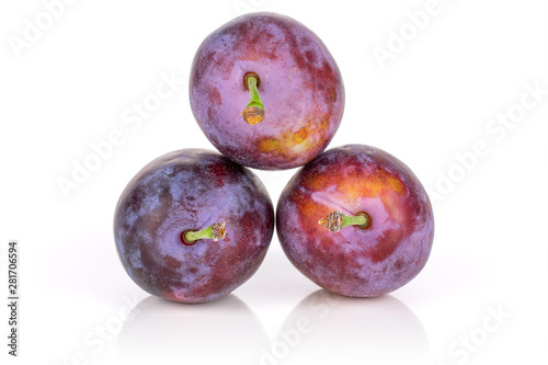Group of three whole fresh blue plum arranged in a pyramid isolated on white background
