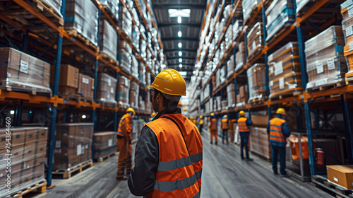 Group of warehouse workers engaged in safety training, wearing protective gear and practicing safe procedures. Generative AI.