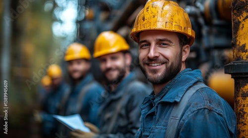 Group of workers wearing safety gear and hard hats smiles while overseeing drilling operations at a mining site. Heavy machinery is visible in the background, indicating active excavation.