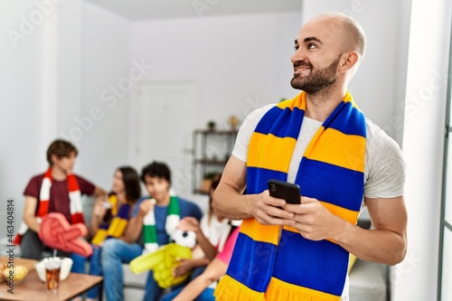Group of young hispanic friends watching and supporting soccer match. Man smiling happy and using smartphone at home.