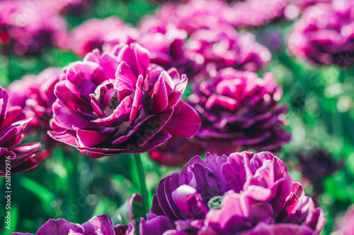 Group purple tulips. Beautiful tulip in a flowerbed.