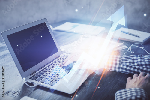 Growing arrows with businessman working on computer on background. Success concept. Double exposure.