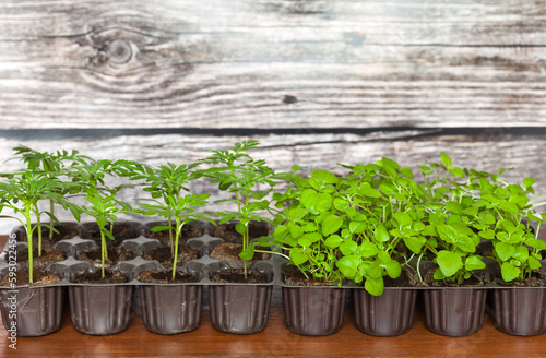 Growing flower seedlings as a hobby. Close-up of young green marigold and ageratum flower seedlings in plastic containers on a wooden table. Spring work in the garden and in the country