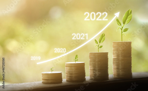 Growing growth year 2019 to 2022. Business graph with arrow up. Growing money coins stack. Saving money investment.