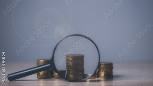 Growing stacks of coins with magnifying glass.