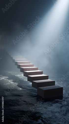 Growth mindset, motivation and self-improvement: Abstract path of floating steps leading through storm into light, motivation, self-transformation.