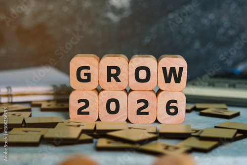 Growth of the year 2026. Wooden cubes with letters on a dark background