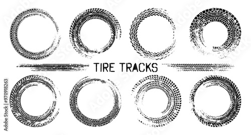 Grunge circle tire tracks, wheel braking marks. Truck, car or motorcycle tread pattern silhouettes. Auto race, motorsport, speed racing design element. Vector illustration