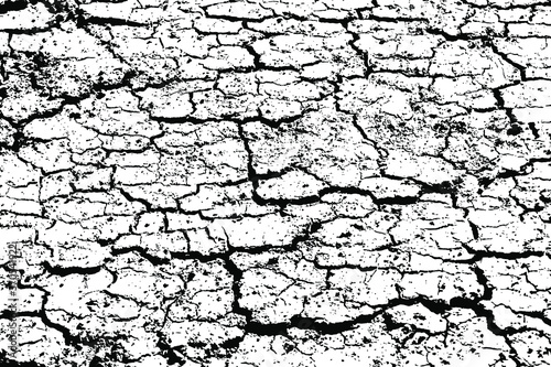 Grunge natural texture of dry cracked soil. Monochrome background of a dry desert surface with cracks, spots, noise and grain. Overlay template. Vector illustration