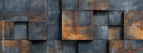 Grungy close-up of a weathered metal tile wall featuring corrosion, rust patterns, and wear for use in design textures.
