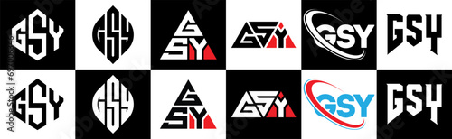 GSY letter logo design in six style. GSY polygon, circle, triangle, hexagon, flat and simple style with black and white color variation letter logo set in one artboard. GSY minimalist and classic logo