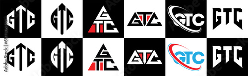 GTC letter logo design in six style. GTC polygon, circle, triangle, hexagon, flat and simple style with black and white color variation letter logo set in one artboard. GTC minimalist and classic logo
