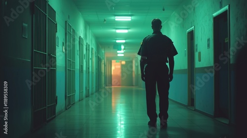 Guard Patrolling Prison Corridor Under Green Light at Night