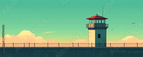 Guard tower overlooking a prison yard with clear blue sky and fluffy clouds.