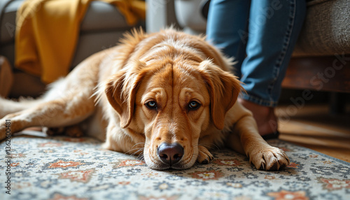 Guide dog resting at home beside owner on a cozy rug